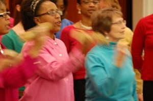 3 groups of adults from the community of Kennedy Heights met at different times but covered the same material, to be presented at the culminating performance. The main idea for this residency was to have a community chorus, so we learned songs from many traditions (I gave context for each) and they were all taught through varied movement activities.