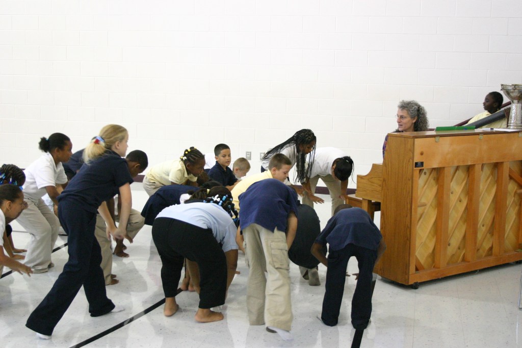 All classes took place either at the Vern Riffe School for Multiply Handicapped, where they dedicated a music room for my work, or on the stage of the recital hall at the Southern Ohio Museum, where there was a lovely grand piano. Activities were based on my way of teaching music through movement and involved learning songs, rhythms, dances (adjusted for each child’s limitations), listening activities, tempo changes, stopping/starting, and making shakers with the help of the museum staff, which we later used in our music making. Students who came to the museum also had a tour of the current exhibit. I also shared my huge collection of rhythm instruments from around the world, and every student got to play each instrument.